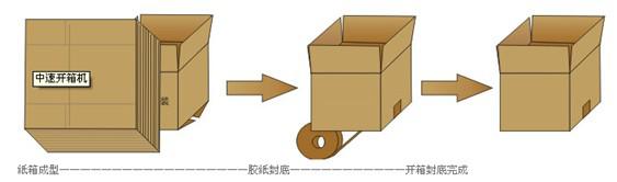開箱機是指自動完成開箱、成形、下底折葉折曲。并現時完成下部分膠帶粘貼,將疊成紙板的箱板打開,箱子底部按一定程序折合,并用膠帶密封后輸送給裝箱機的專用設備。自動紙箱成型機、自動開箱機是大批量紙箱自動開箱、自動折合下蓋、自動密封下底膠帶的流水線設備,機器全部采用PLC+顯示屏控制,大大方便操作,是自動化規模生產必不可少的設備。